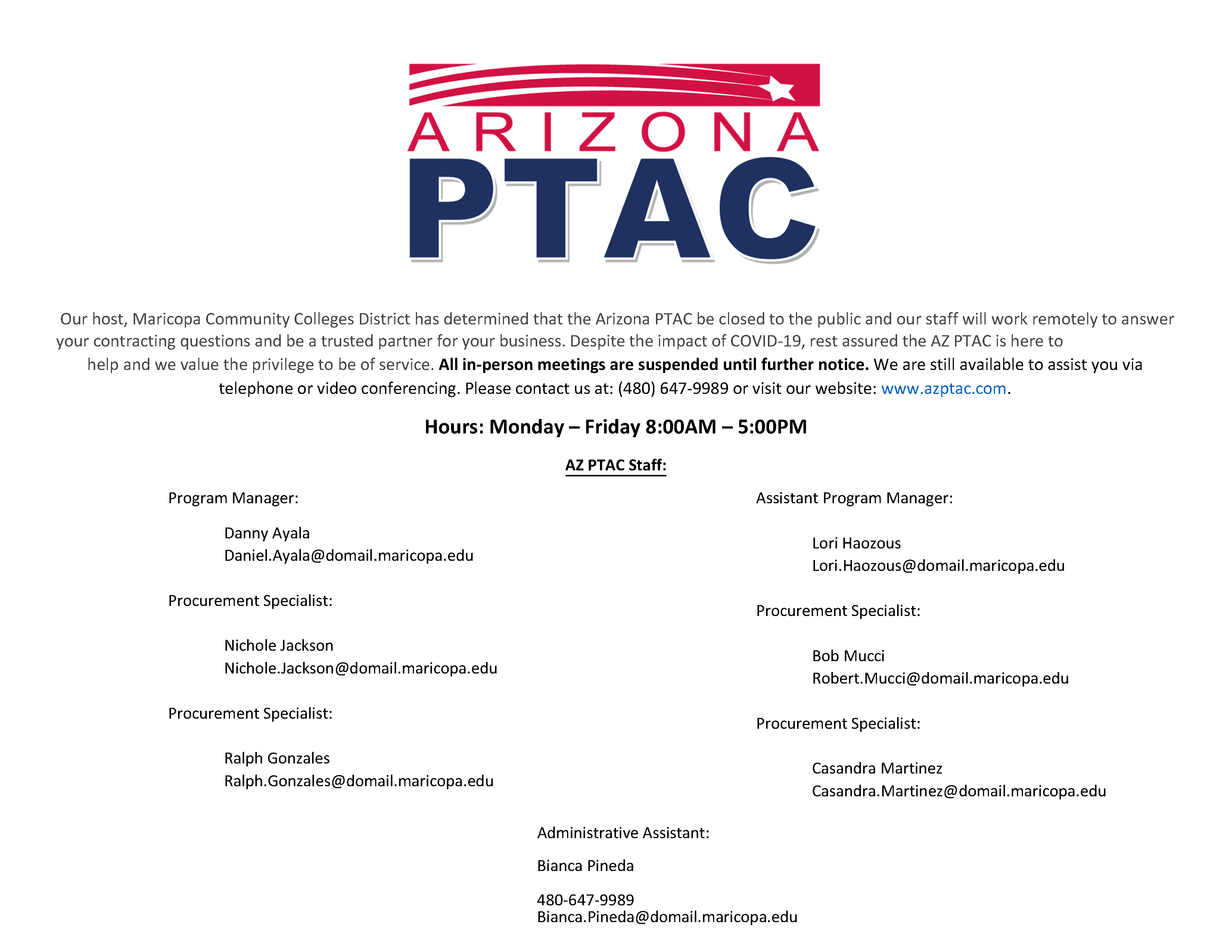 The Arizona Procurement Technical Assistance Center (AZPTAC) works with small business owners to help them realize the opportunities in government contracting. We do this by providing confidential, no cost, one-on-one counseling to small businesses throughout the State of Arizona. AZPTAC is linked to the national PTAC association which has more than 300 offices nationwide.